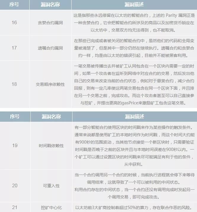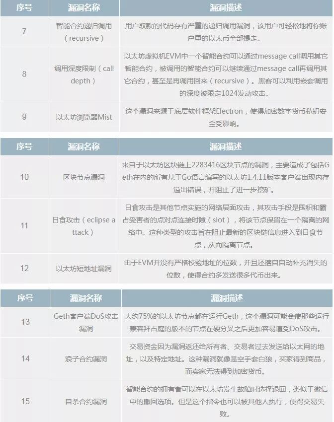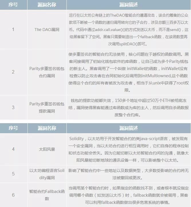 据有关调查统计,以太坊主要漏洞情况描述如下表: